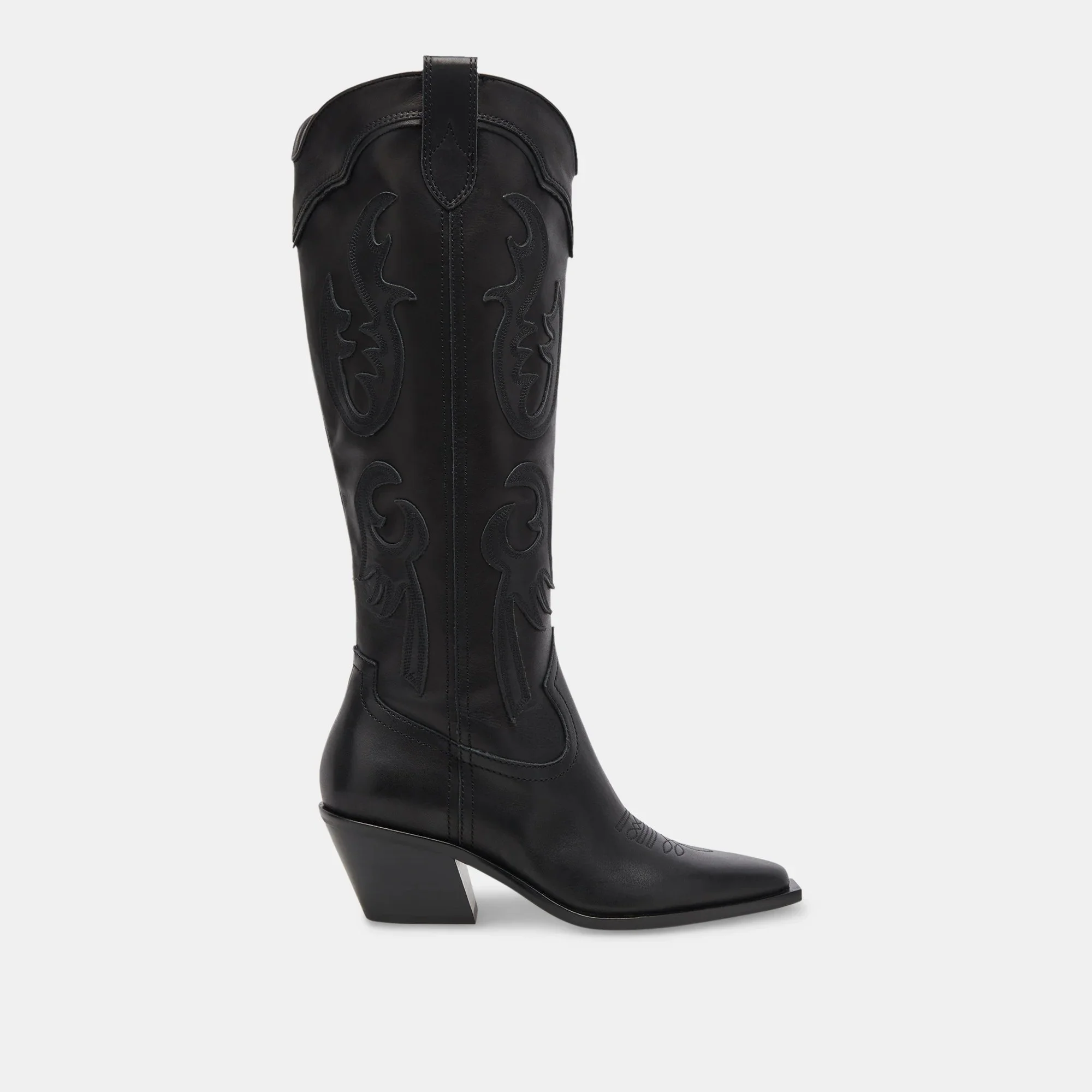 Reformation Soleil Knit Dress in Black YSL Cassandra Mini Top Handle Bag in Crocodile-Embossed Shiny Leather Dolce Vita Samsin Boots in Black